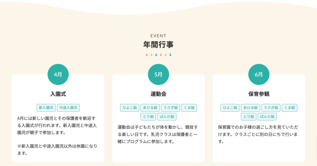 コピペで使える WordPress のブロックパターンライブラリ「保育園・幼稚園 _年間行事とギャラリー」のパターンです。